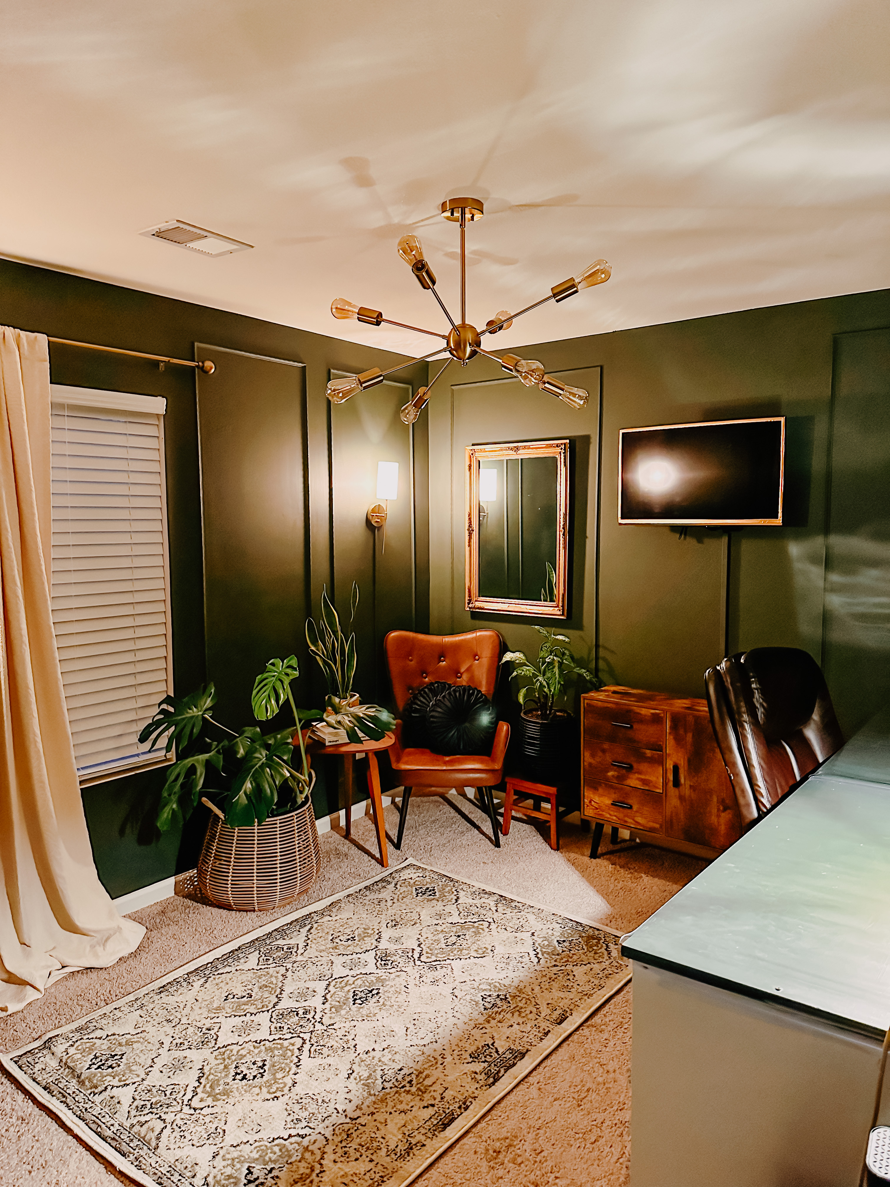 Up next, I wanted to change out the overhead lighting for something a little more modern. I went to Amazon and searched ‘modern chandeliers’ and found this beauty. The chandelier was available in either black or antique gold and with a paint color so rich, I knew black would not elevate the look in the way it deserved. I decided to go with gold and boy am I so glad I did. The theme of gold would play a HUGE part in the lighting and décor in this space including two of these wall sconces I also found at Lowe’s. The green, the gold, and the glow of this area was shaping up to be exactly what I imagined this project would be.